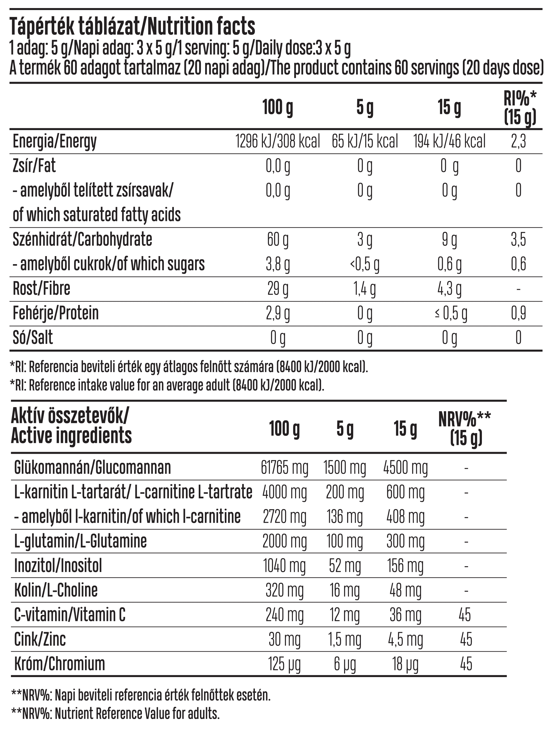 Maltodextrin, glükomannán (Amorphophallus konjac gumós gyökeréből, kén-dioxid), L-karnitin L-tartarát L-glutamin, inozitol, kolin-bitartarát, L-aszkorbinsav, cink-biszglicinát, króm-pikolinát.