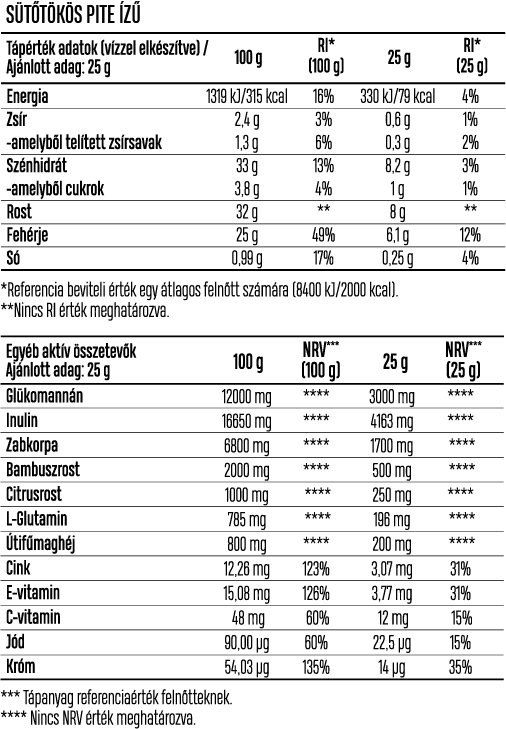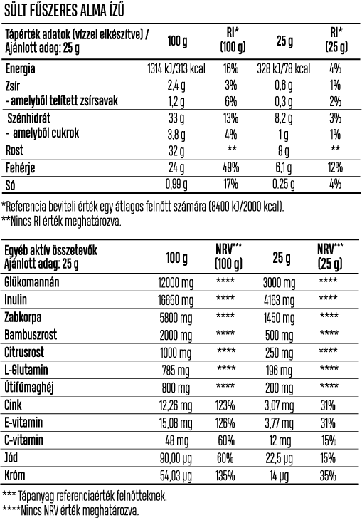 instant tejsavófehérje-koncentrátum (tej) {tejsavófehérje-koncentrátum (tej), emulgeálószer [lecitinek (szója)]}, instant rizsliszt, inulin, glükomannán (Amorphophallus konjac gumóból) (kén-dioxid), zabkorpa (glutén), aromák, bambuszrost (Dendrocalamus latiflorus szárából), fahéjpor, citrusrost [citrom (Citrus limon) és lime (Citrus aurantiifolia) gyümölcséből], só, útifűmaghéj por, L-glutamin, sav (almasav), édesítőszerek (szukralóz, aceszulfám K), csomósodást gátló anyag (szilícium-dioxid), C-vitamin (L-aszkorbinsav), E-vitamin-készítmény [DL-alfa-tokoferil-acetát, csomósodást gátló anyag (szilícium-dioxid)], cink-szulfát, kálium-jodid, króm-pikolinát