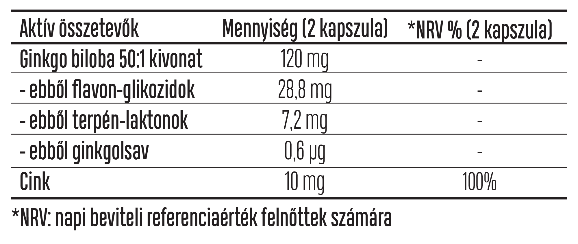 A ginkgo biloba, más néven páfrányfenyő, Ázsiában őshonos, hosszú életű fa, amelyet évszázadok óta használnak a hagyományos gyógyászatban. A készítmény Ginkgo biloba levélkivonatot tartalmaz 50:1 arányú koncentrátumban, amely flavon-glikozidokat és terpén-laktonokat is hordoz. A növényi kivonat mellett cink-biszglicinát is található a termékben, amely egy jól hasznosuló szerves cinkforma.