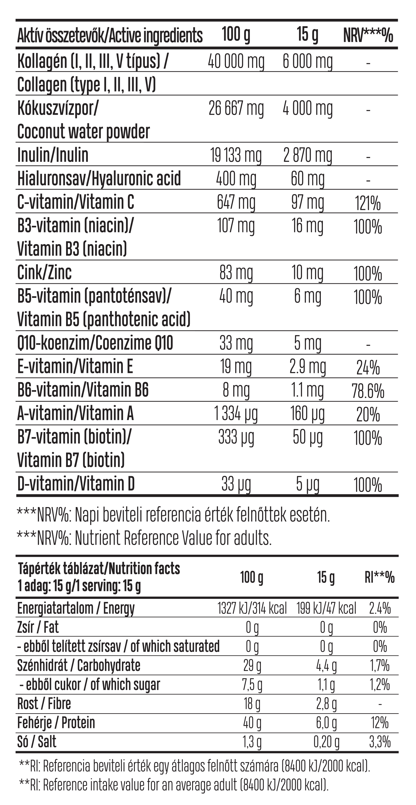 Összetevők: hidrolizált marhakollagén, kókuszvízpor (kókuszvízpor, maltodextrin), inulin (cikória gyökérrost), étkezési sav (citromsav), aroma, hidrolizált tengeri halkollagén, édesítőszerek (aceszulfám K, szukralóz), étkezési só, L-aszkorbinsav, nátrium-hialuronát, cink-biszglicinát, nikotinamid, DL-alfa-tokoferil-acetát por, kalcium-D-pantotenát, Q10-koenzim, retinil-acetát, piridoxin-hidroklorid, kolekalciferol, D-biotin.
