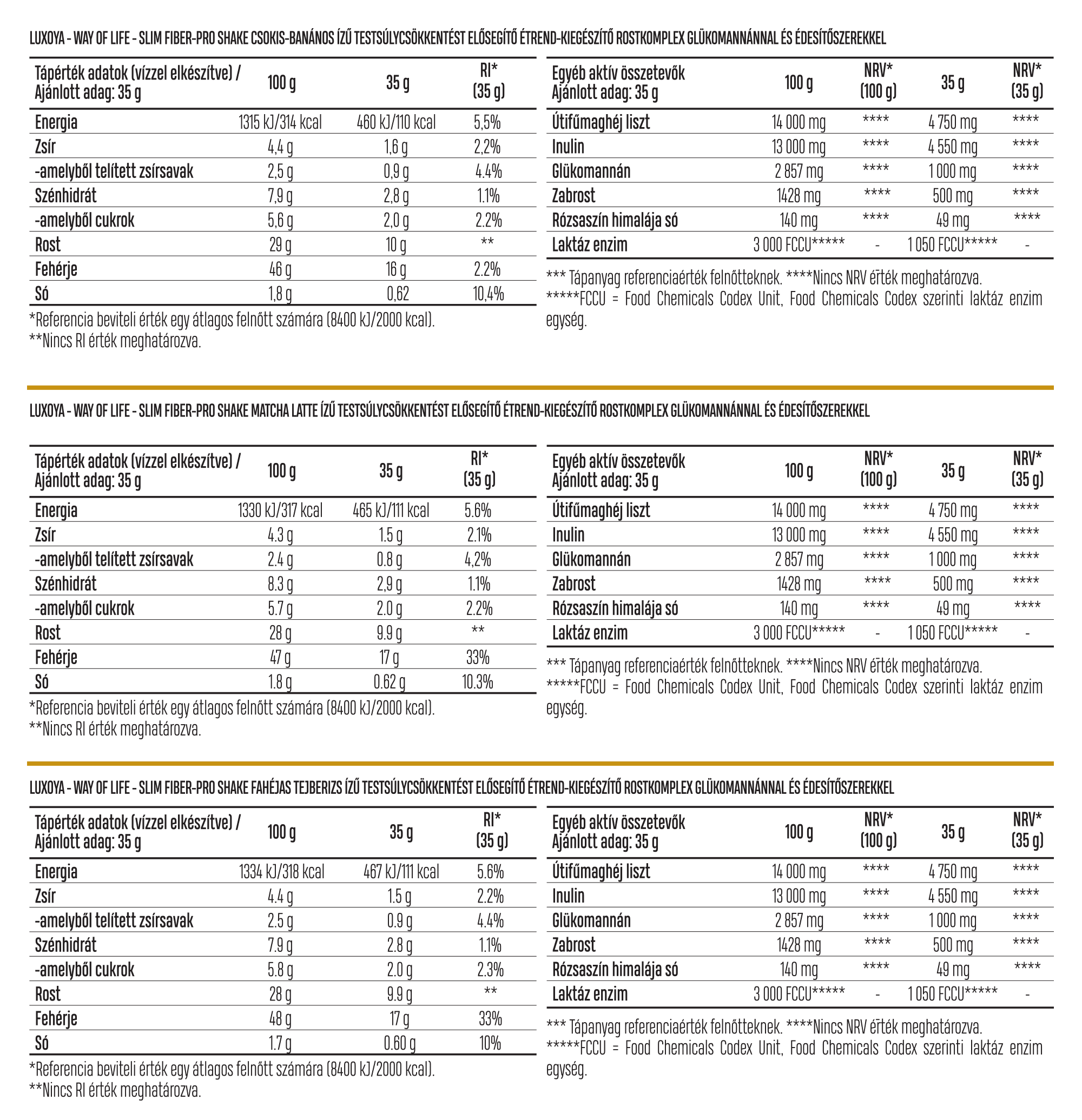 instant tejsavófehérje-koncentrátum (tejből, emulgeálószer: napraforgólecitin), 14% útifűmaghéj (Plantago Ovata) liszt, inulin, sovány tejpor, glükomannán (Amorphophallus konjac gumós gyökérből) (kén-dioxid), aromák, sűrítőanyag (xantán gumi), zabrost, só, édesítőszerek (aceszulfám K, szukralóz), rózsaszín himalájasó, laktáz enzim készítmény (maltodextrin [kukorica], laktáz enzim [β-galaktózidáz], nátrium-klorid), színezékek (brilliánskék FCF, tartrazin****).