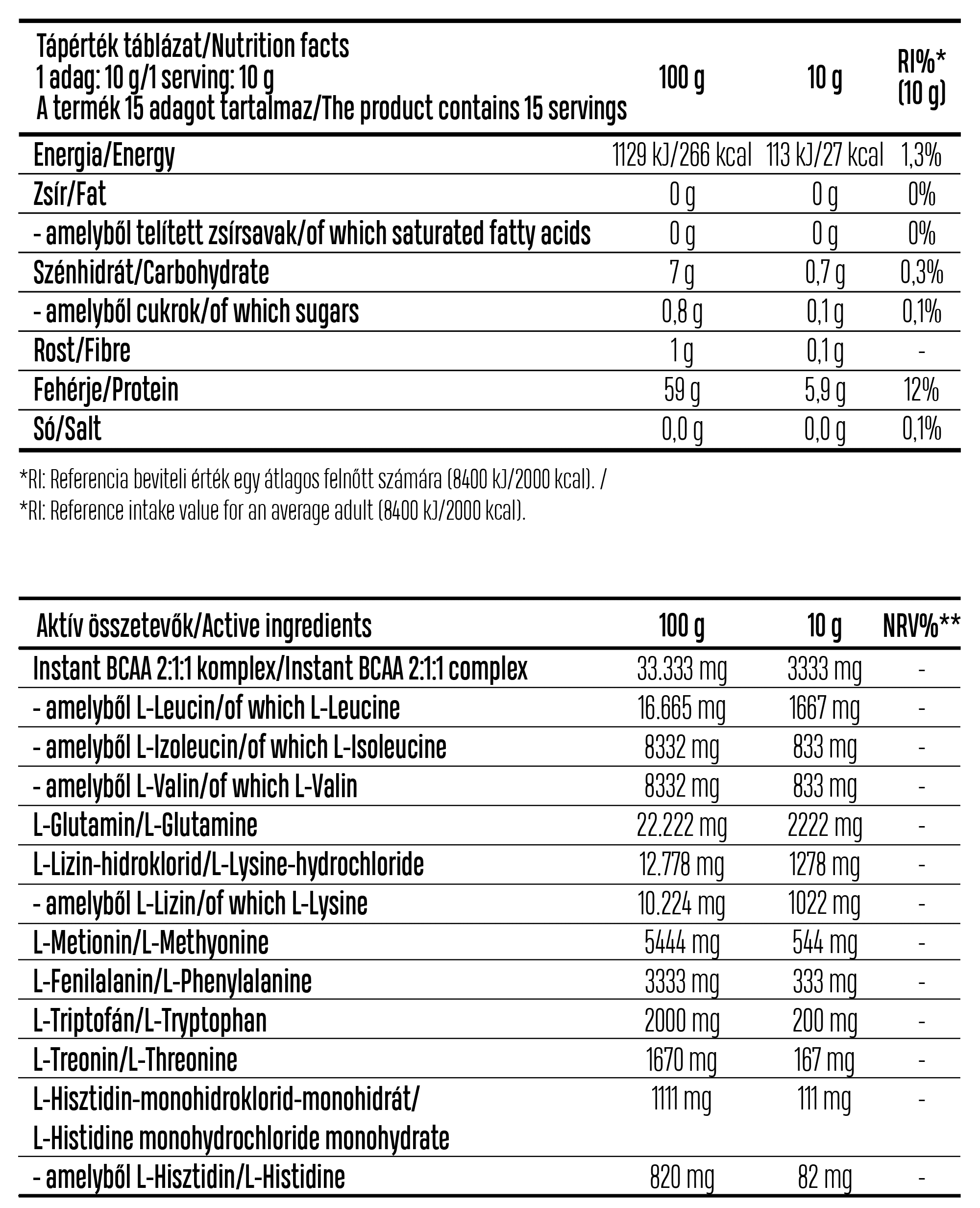 Instant BCAA (elágazó láncú aminosavak) 2:1:1 komplex (L-leucin, L-izoleucin, L-valin, emulgeálószer: napraforgó lecitin), L-glutamin, L-lizin-hidroklorid, savanyúságot szabályozó anyagok (vízmentes citromsav, almasav), L-metionin, aromák, L-fenilalanin, csomósodást gátló anyag (trikalcium-foszfát), L-triptofán, édesítőszerek (aceszulfám K, szukralóz), L-treonin, L-hisztidin-monohidroklorid-monohidrát, színezék (kurkumin, céklavörös).