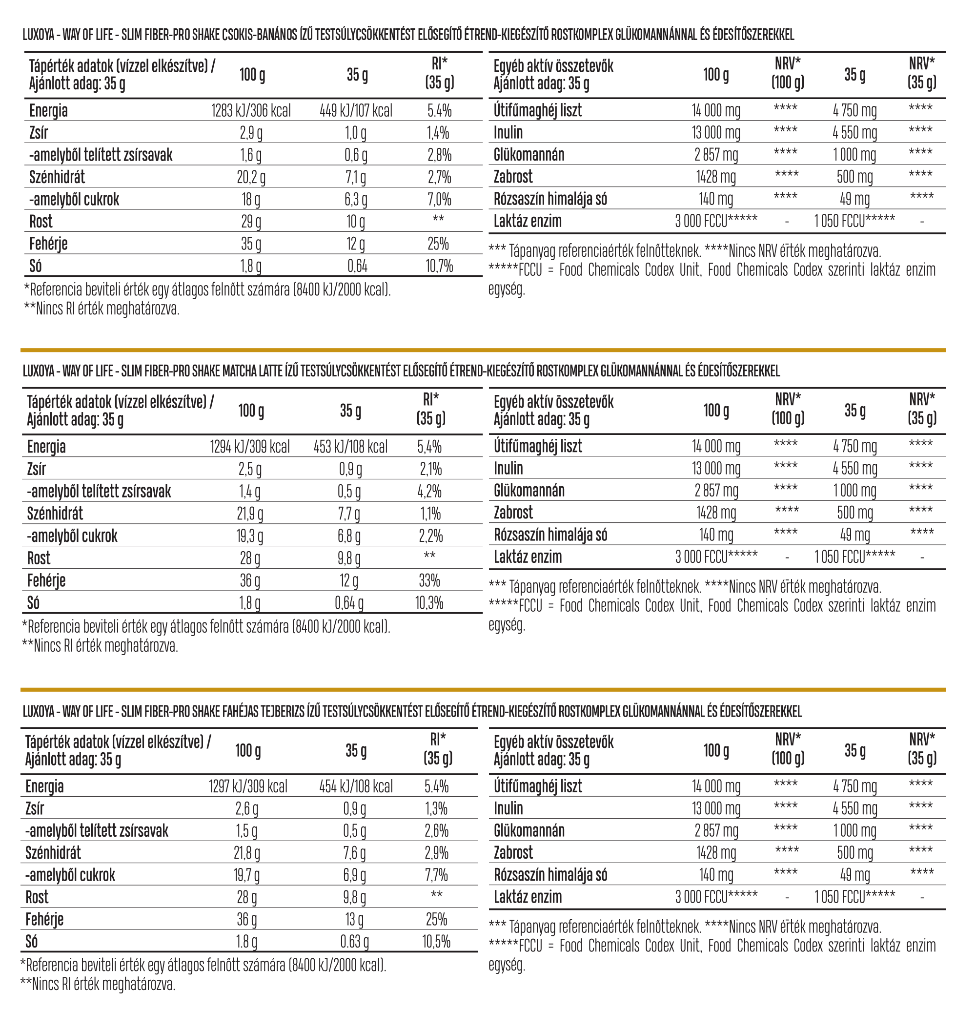 instant tejsavófehérje-koncentrátum (tejből, emulgeálószer: napraforgólecitin), 14% útifűmaghéj (Plantago Ovata) liszt, inulin, sovány tejpor, glükomannán (Amorphophallus konjac gumós gyökérből) (kén-dioxid), aromák, sűrítőanyag (xantán gumi), zabrost, só, édesítőszerek (aceszulfám K, szukralóz), rózsaszín himalájasó, laktáz enzim készítmény (maltodextrin [kukorica], laktáz enzim [β-galaktózidáz], nátrium-klorid), színezékek (brilliánskék FCF, tartrazin****).